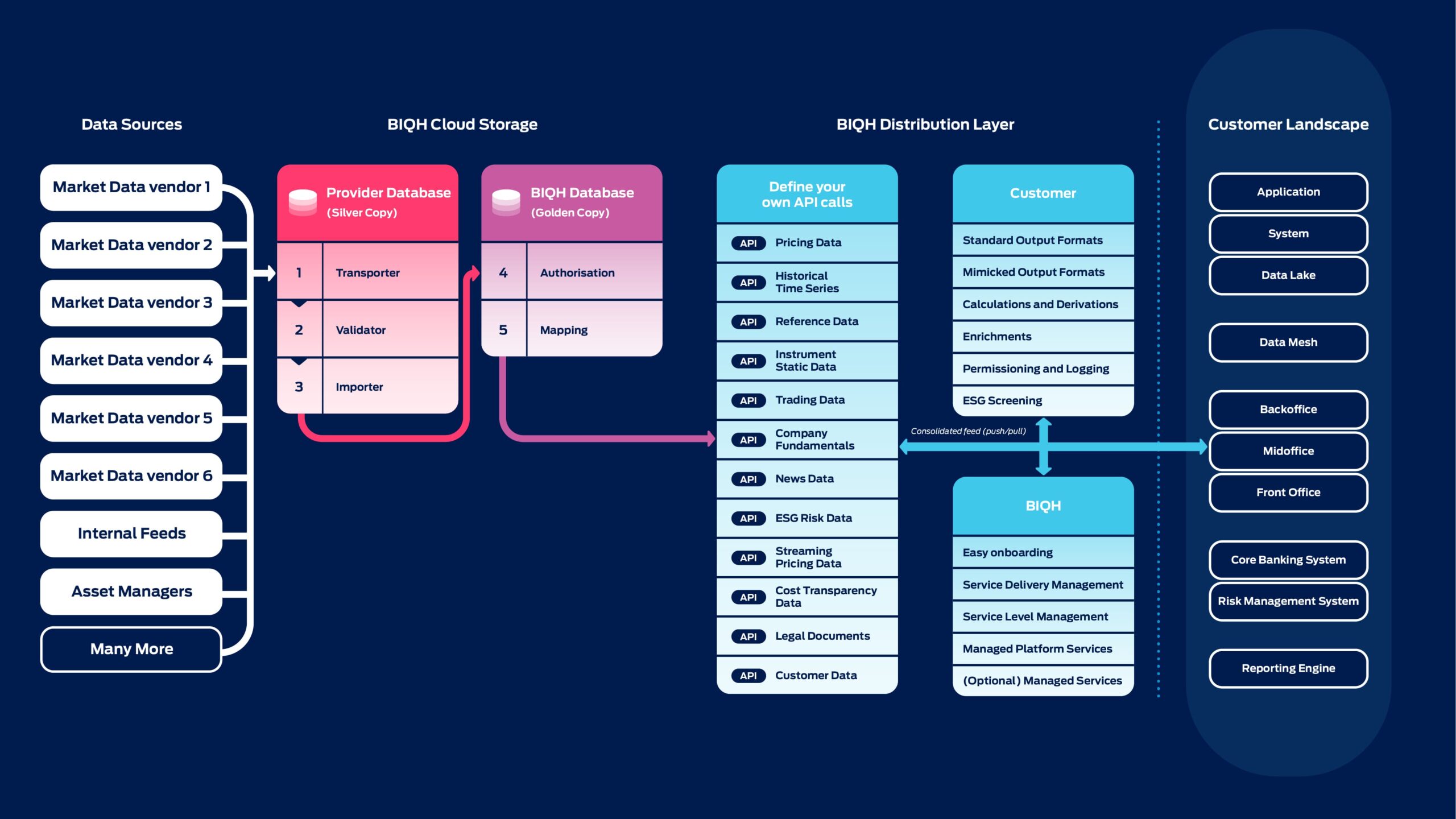 The BIQH Market Data Platform consolidates, validates and distributes market data. It maximises efficiency, ensures compliance and gives you full control of your market data landscape, with seamless integration into existing and new applications and systems.